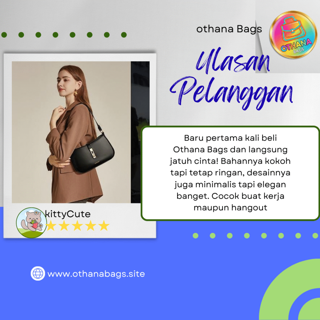Dengan gaya modern minimalis, Othana Bags dirancang untuk menemani berbagai aktivitas — mulai dari bekerja, berkuliah, hingga traveling. Koleksinya mencakup berbagai jenis tas seperti tote bag, sling bag, backpack, dan pouch, yang semuanya mengutamakan keseimbangan antara estetika dan kepraktisan.
